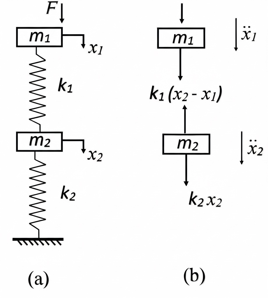 A two degree of freedom system can be defined as a system, that requires two independent variables to describe its position from the equilibrium. It has two equations of motion i.e., for two masses or for each degree of freedom. It introduces the coupling phenomenon where the motion of any one of the two independent coordinates is dependent on the other, through the coupling springs or dash-pots. Consider an ideal two degrees of freedom system as shown in Fig. 2, where the masses are constrained to move in the direction of the spring axes. Let and be the displacements of the masses at any instant measured from the equilibrium positions of these masses respectively, which are positive in the direction shown. Let’s assume >
